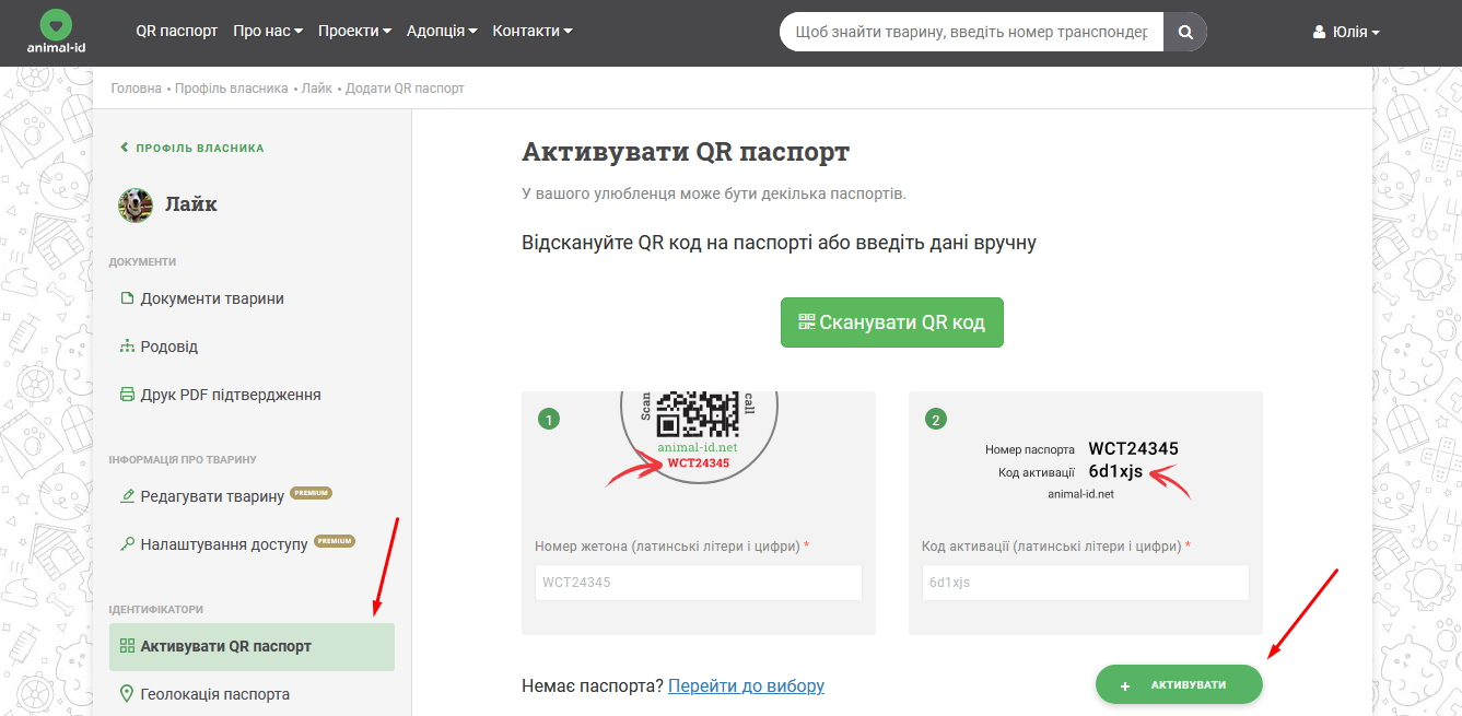 Зайдіть у профіль тварини та натисніть кнопку "Активувати QR паспорт".