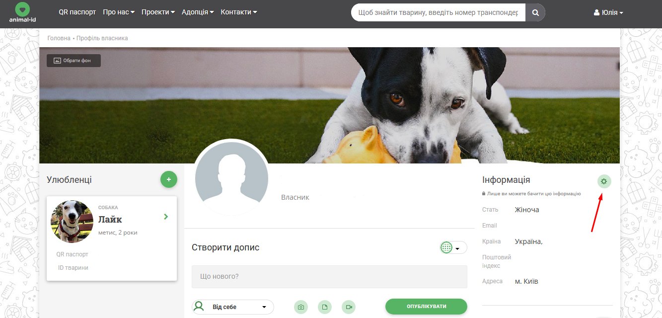 Або зайдіть у ваш профіль. Перейдіть у налаштування (зелений кружечок справа біля розділу “Інформація”) або за посиланням - https://animal-id.net/ua/user/edit-profile